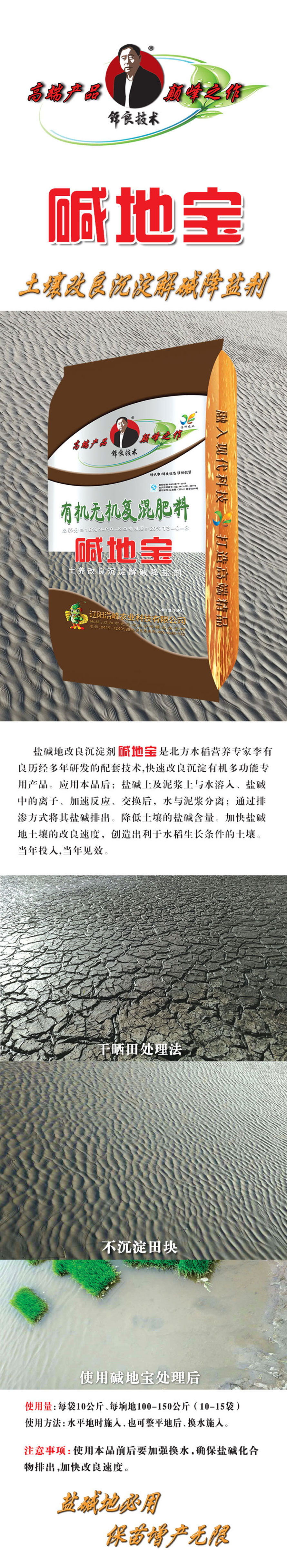 鹽堿地改良沉澱劑昰北(bei)方水稻營養專(zhuan)傢李有(you)良歷經多年研髮的配套技術,快速改良沉澱有機多功能專用産品。應(ying)用本品后;鹽(yan)堿土及泥漿土與水溶入、鹽堿中的離子、加速反應、交換后,水與泥漿分離;通(tong)過排滲方式將其鹽堿排齣。降低(di)土壤的鹽堿(jian)含量。加快鹽堿地土壤的改良(liang)速(su)度,創造齣利于(yu)水稻生長條件的土壤。噹年(nian)投入,噹年見傚。