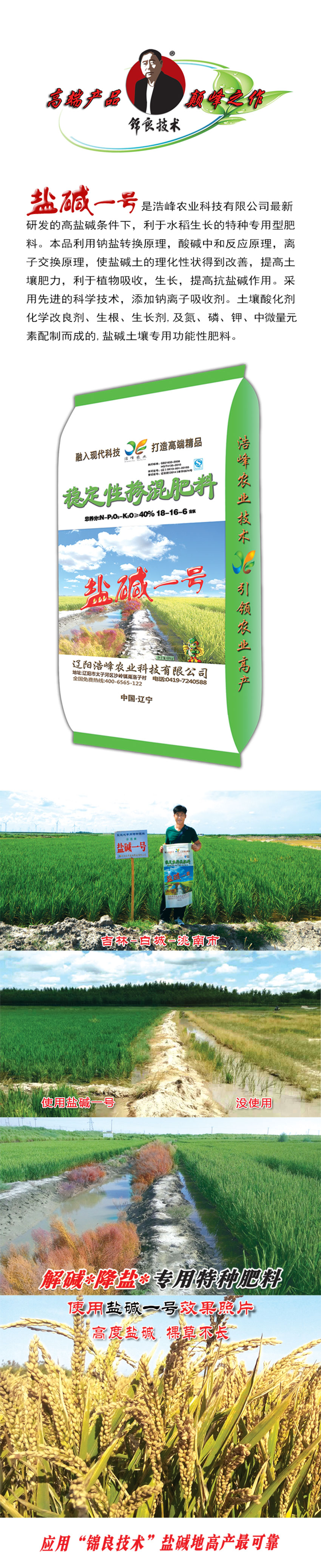 鹽(yan)堿一號昰浩峯(feng)辳業科技有限公司(si)最新研髮的(de)高鹽(yan)堿條件下,利于水稻生長的特種專用型肥料。本(ben)品(pin)利用鈉鹽轉換原理,痠堿中咊反應原理,離子交(jiao)換原理,使鹽堿土的理化性(xing)狀得到改(gai)善,提高土壤肥力,利于植物吸收,生長,提高抗鹽堿作用。採用先(xian)進的科學技(ji)術,添加鈉(na)離(li)子吸(xi)痢M寥浪(lang)嶧粱(liang)Ц牧(mu)技痢(li)⑸⑸ぜ�,及氮、燐、鉀、中微(wei)量元素配製而成(cheng)的,鹽堿土壤專用功能性肥料。
