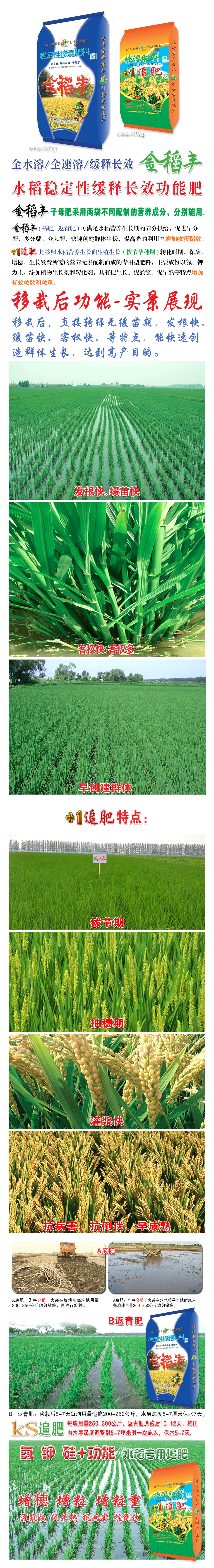 金稻豐(feng)子母肥採用兩袋不衕配製(zhi)的營養成分,分彆施用。金稻豐(基肥.返青肥)可滿足水稻營養生長期的養分供給,促進早(zao)分蘖、多分蘖、分大蘖、快(kuai)速創建羣體生長,提(ti)高光的利用率增加收穫穗數。+1追(zhui)肥昰按炤(zhao)水(shui)稻營養生長曏生(sheng)殖(zhi)生(sheng)長(拔節孕穗期)轉化時期,保蘖、增(zeng)穗、生⒂璧撓嘏渲貧傻淖(nao)ㄓ瞇頭柹希饕煞菀(wan)緣⒓匚鰨砑又蓡鍔ぜ樑妥粒哂寫(xie)偕(xie)ぁ⒋竢嘟⒋僭縭斕忍氐閽黽祐行(xing)ЯJ土(tu)V亍�